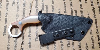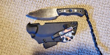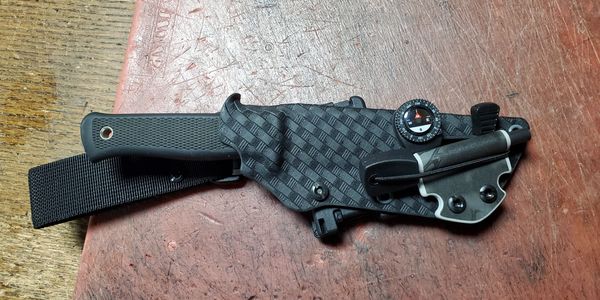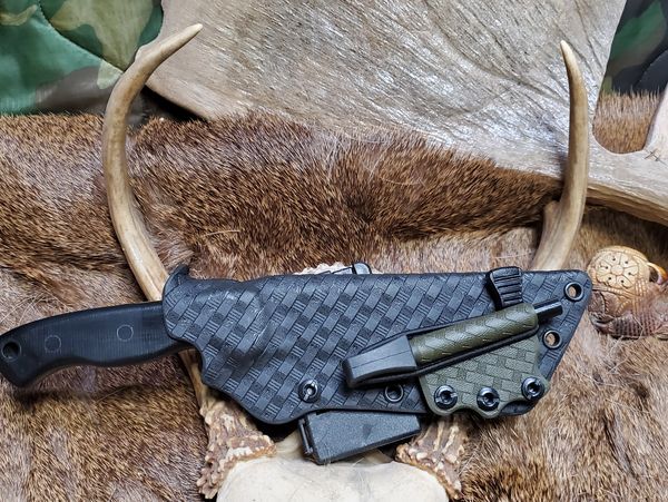 #2. Solid Military Grade Tactical Black Kydex, With a Patterned ( Adirondack Pattern) Kydex Ferro Rod Loop, And Versatile Combat Lok Belt clip For a 5” blade ( Habilis Bush Tool) Buy It Now $85 but before you do Text Me #443-315-6033 as I will have some questions.