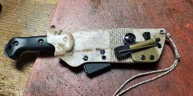 #1. This is an example of a patterned Military grade kydex , It is called krypek Nomad, and is $9 extra it also has a coyote brown ferro rod holder with ferro rod, standard mini compass, and combat lok belt clip, This is a 7” blade (BK7) which is $7 extra. For all questions text me # 443-315-6033. YHCK