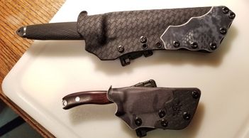 If you want to carry two knives on the same sheath, We can do it more securely, bombproof, and far lighter weight than any of those other guys.